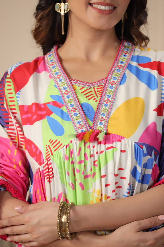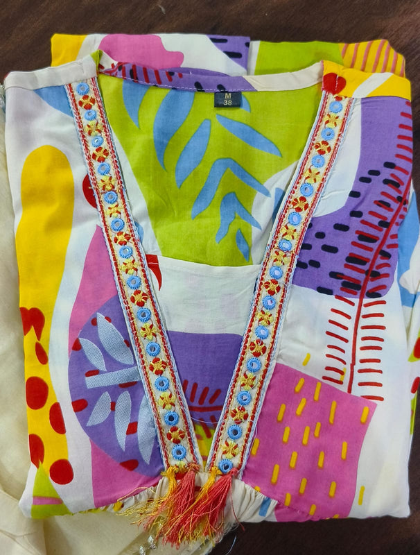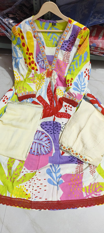 Designer pattern floral print Cotton full flair Anarkali Kurti with lots of Gota detailing & embroidery paired with Cotton harem salwar and multicolor dupatta.